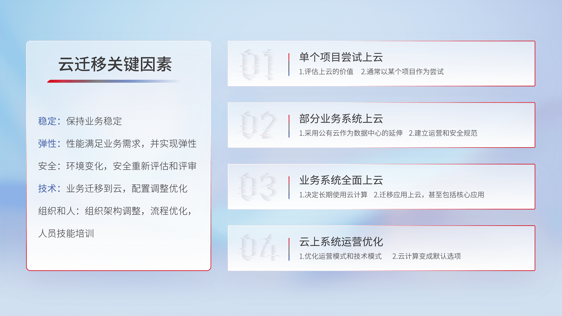结合实际业务,,从规划设计、、、云平台选型、、、、云原生改造、、、数据迁移、、、、集成交付,,迁移全过程为客户识别最佳上云路径,,做好风险识别管理,,设计网络架构、、、身份权限、、、、安全审计合规、、、、操作审计、、、日志审计、、监控告警策略、、、、多站点容灾设计等,,对云上基础设施进行整体规划,,,,提升IT治理水平,,,,以满足弹性、、高可用、、、高性能的需求。。。。