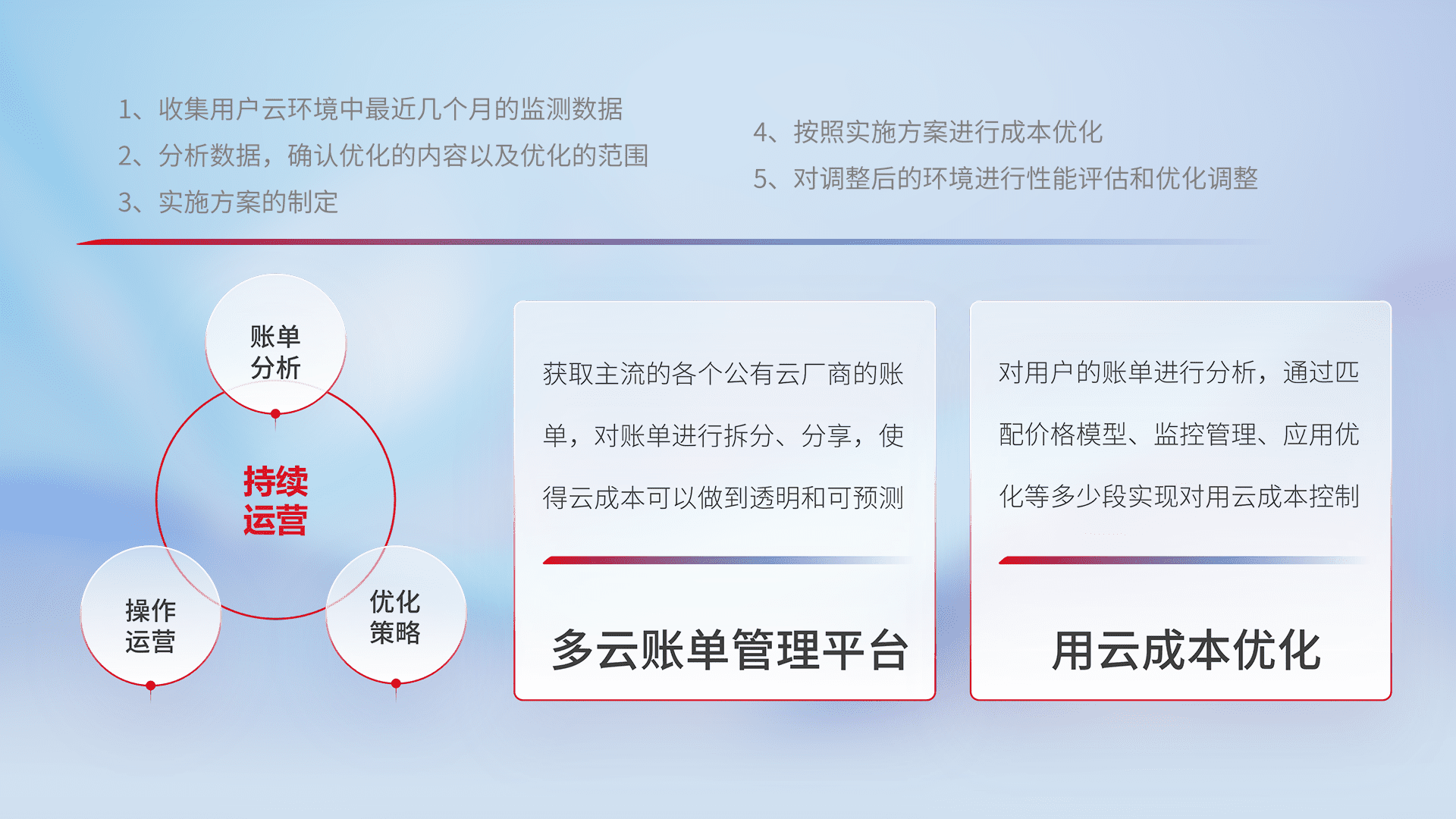 通过多云纳管,,,以统一的资源数据模型把客户的云资源进行抽象和封装,,进而实现对多云资源的统一操作,,保障云资源管理的可靠性、、稳定性与可用性。。。量身定制化运维内容,,配置、、、、开发运维、、补丁管理、、、备份、、、、监控、、、、认证和访问管理、、、、审计和日常巡检等,,保障在用云过程中的可靠度,,,,稳定度以及高可用率。。