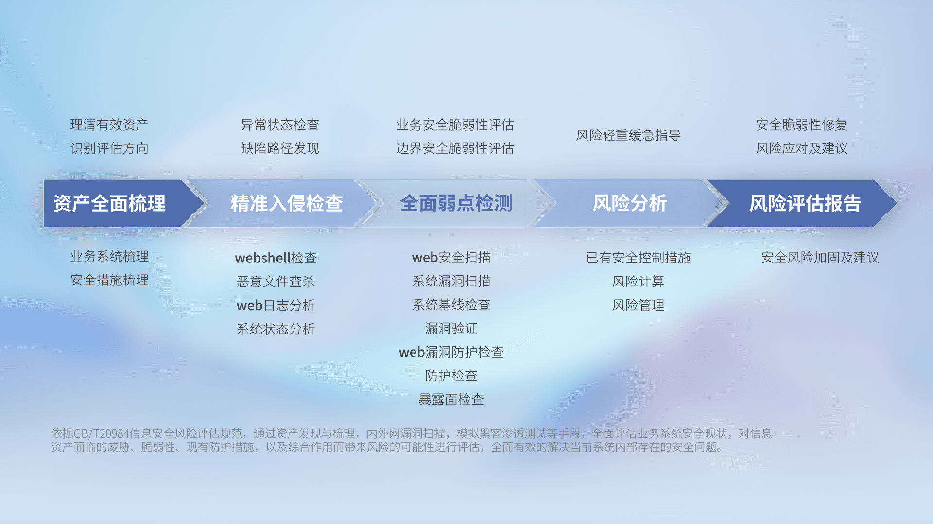 针对客户行业特性,,,以专业的安全服务+多厂商联合解决方案提供专属的一站式安全管理服务,,,帮助客户全面感知网络空间威胁,,,基于识别、、检测、、、分析、、、、防护、、、监测、、、响应的服务理论模型,,从方案咨询、、集成交付、、、评估验证、、优化加固、、、、运维运营,,,致力于为客户提供完整的闭环管理式安全服务。。。以实战经验为客户打造高抵御风险的安全体系,,,,帮助客户发现威胁、、对抗威胁、、处置威胁,,,,不断积累安全对抗能力,,,持续保障数字化安全。。